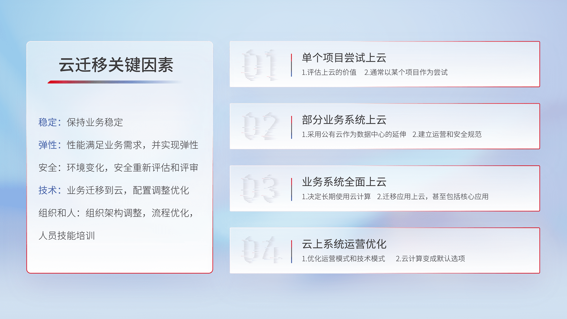 结合实际业务,,,,从规划设计、、、云平台选型、、云原生改造、、、、数据迁移、、集成交付,,迁移全过程为客户识别最佳上云路径,,做好风险识别管理,,设计网络架构、、身份权限、、、、安全审计合规、、、、操作审计、、、日志审计、、、监控告警策略、、多站点容灾设计等,,,,对云上基础设施进行整体规划,,,提升IT治理水平,,,,以满足弹性、、高可用、、高性能的需求。。